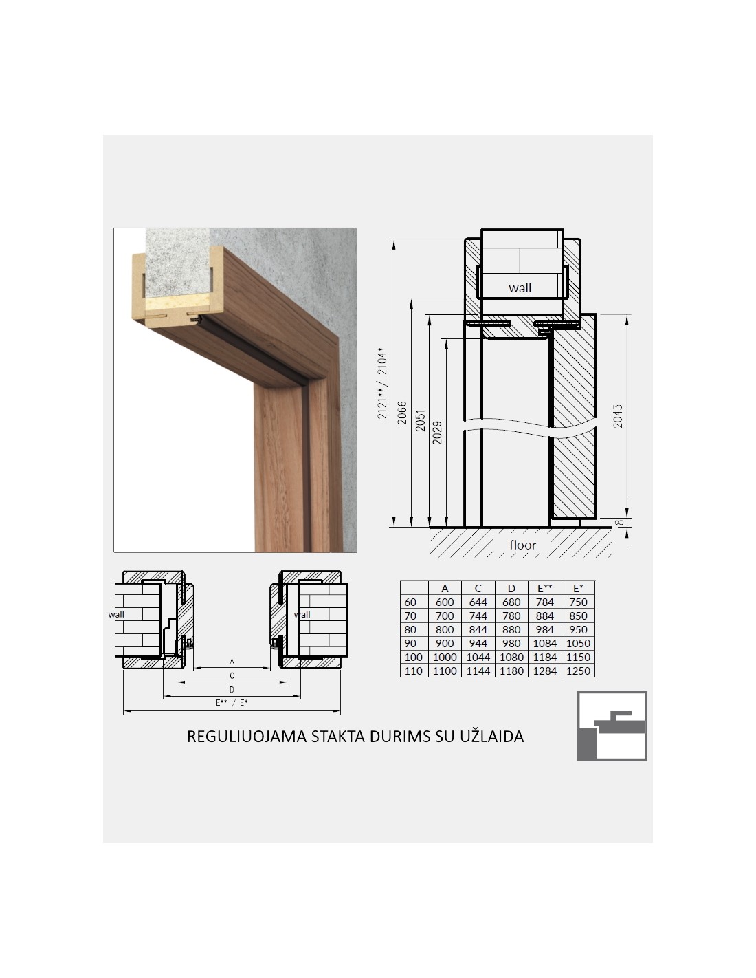 The adjustable frame is equipped with architraves on both sides, the width of the frame can be selected according to the thickness of the wall, it can be used for walls with a thickness of 75-320 mm.
