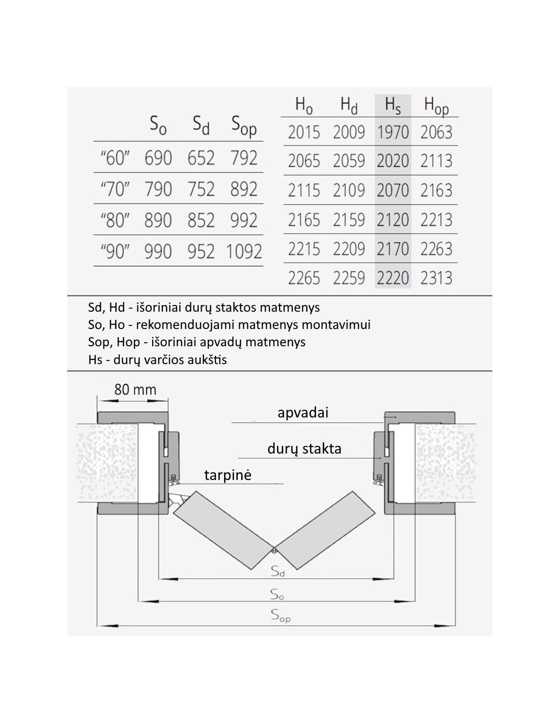 *Sienoje anga turi būti ne žemesnė kaip 2009 mm (1970 mm varčios), ne žemesnė kaip 2259 mm (2220 mm varčios) ir ne siauresnė kaip 660 mm. Apvadai gali uždengti iki 2063 mm (1970 mm varčios) arba 2313 mm (2220 mm varčios) aukščio sienos angą.